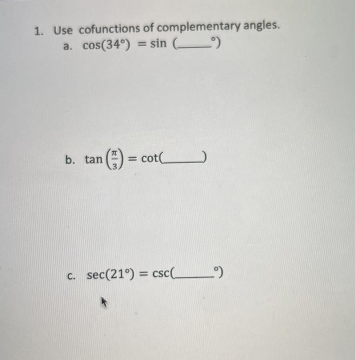 Solved 1. Use cofunctions of complementary angles. a. | Chegg.com