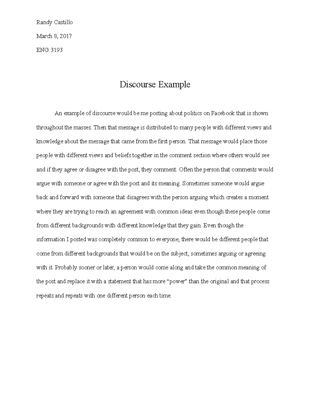 Discourse Example - Randy Castillo March 8, 2017 ENG 3193 Discourse ...