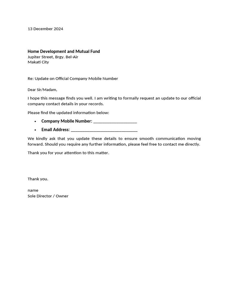 HDMF Request Letter to Update Mobile Number | PDF