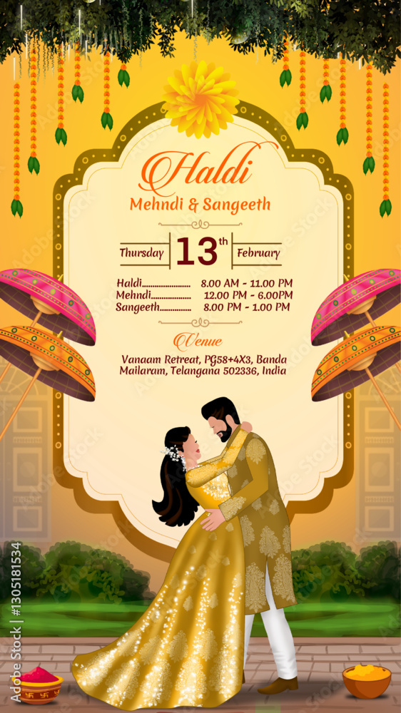 Haldi and Mehandi Ceremony Invitation with Illustrated Indian Couple ...