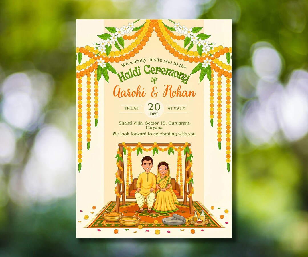 Haldi Ceremony Invitation, Couple on Swing, Marigold Jhula, Indian ...