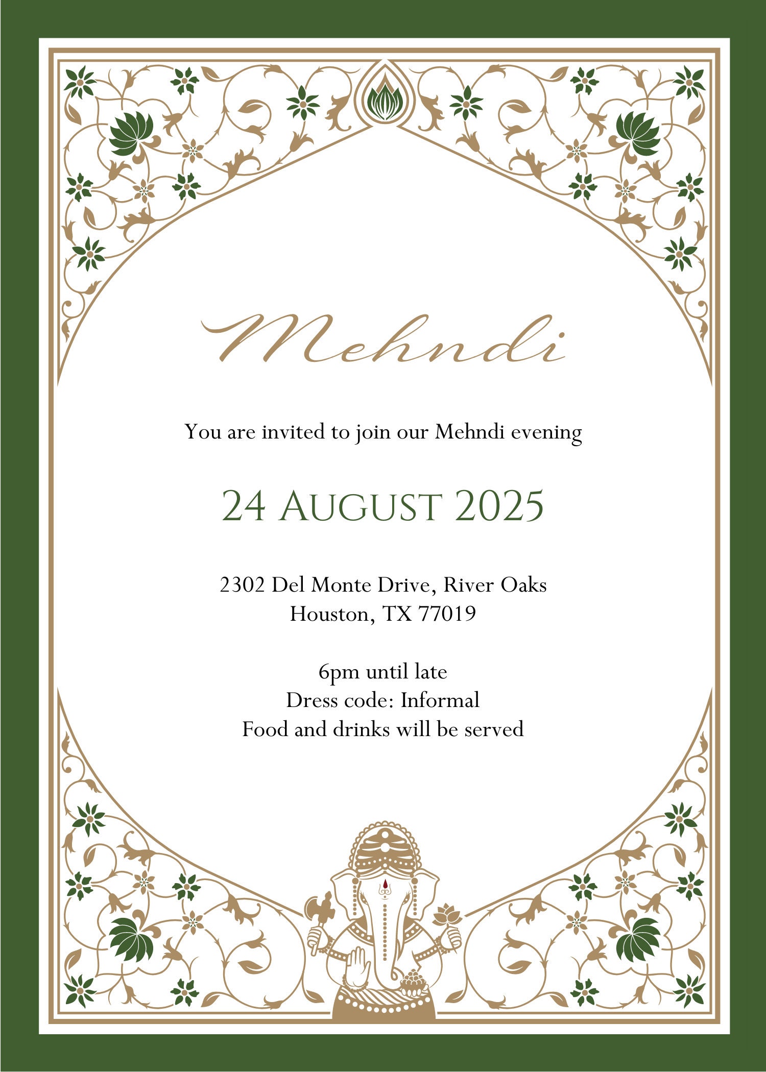 Luxury Indian Hindu Mehndi Invitation Template - Green Ganesh A5 ...