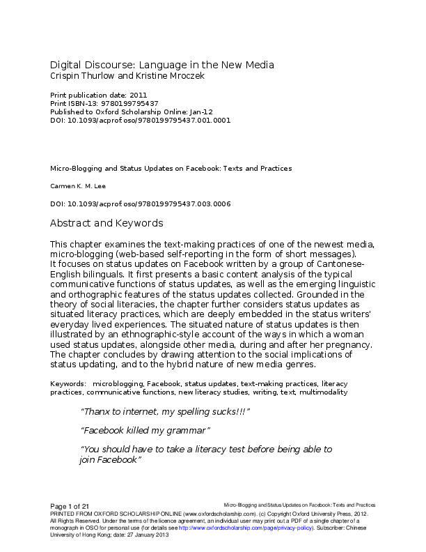 (PDF) Micro-Blogging and Status Updates on Facebook: Texts and Practices