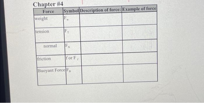 Solved Chapter #4 Force Symbol Description of force: Example | Chegg.com