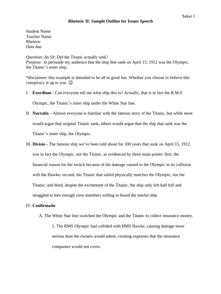 SOLUTION: Example of informative speech outline the titanic - Studypool