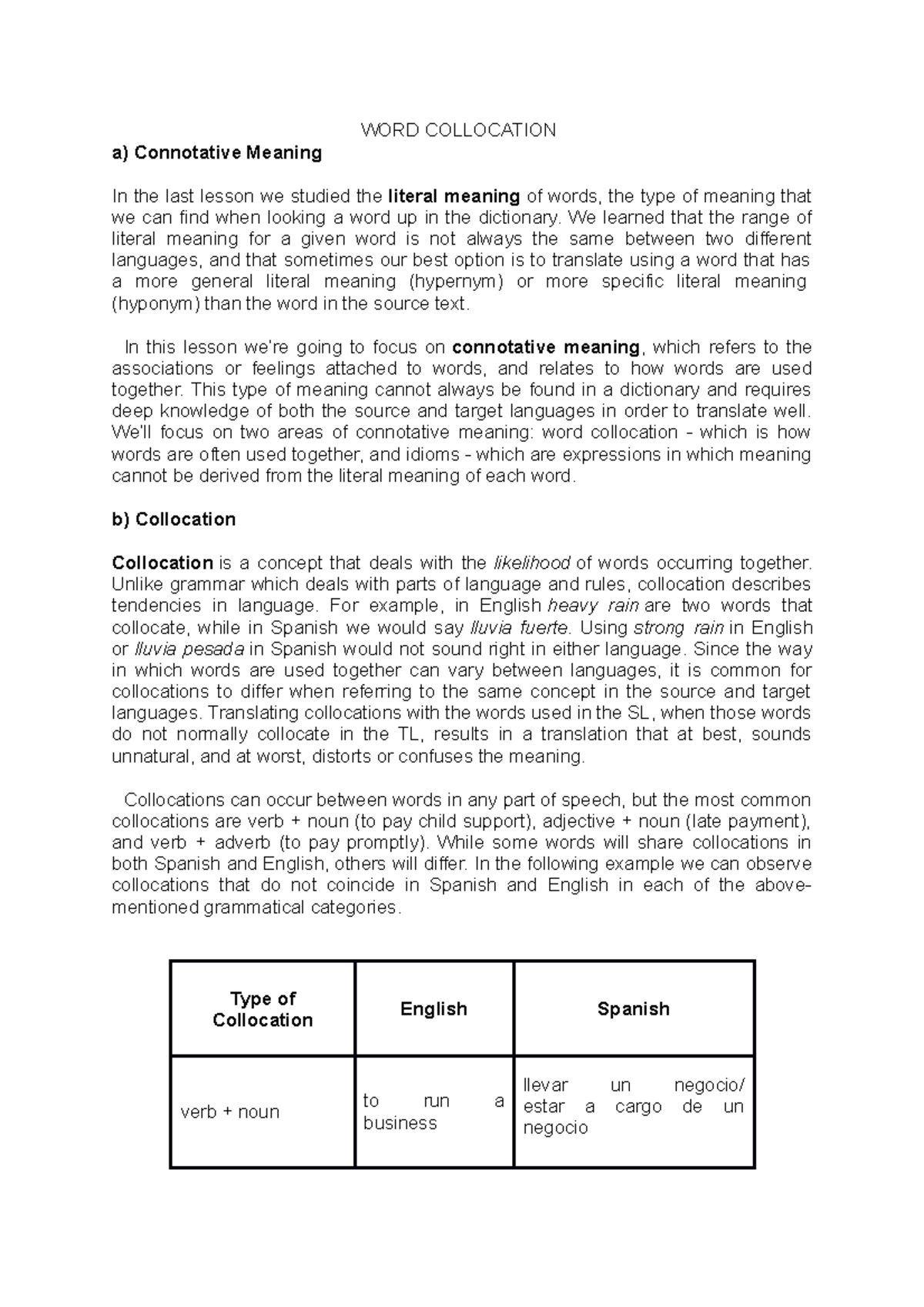 Word Collocation ENG-ESP - WORD COLLOCATION a) Connotative Meaning In ...
