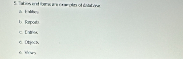 Solved: Tables and forms are examples of database: a. Entities b ...