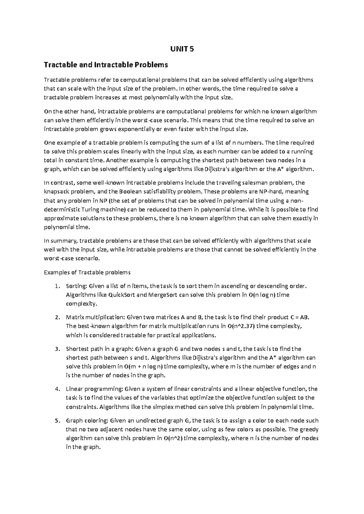 CS3401 ALG UNIT 5: Tractable vs Intractable Problems Notes - Studocu