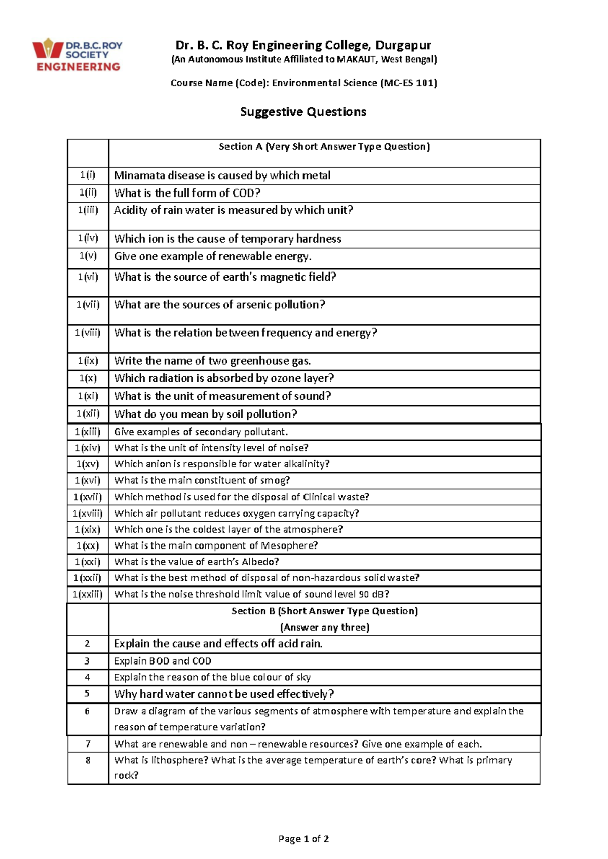 MC-ES101 Environmental Science Suggested Questions for Exam Prep - Studocu