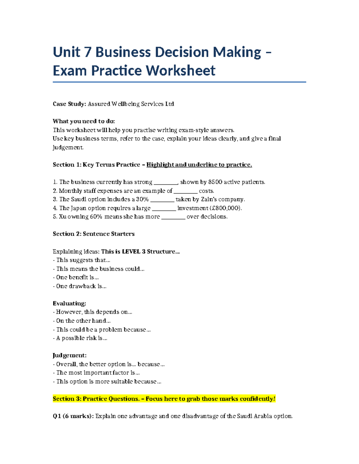 Unit 7 Business Decision Making Exam Practice: Case Study on Assured ...