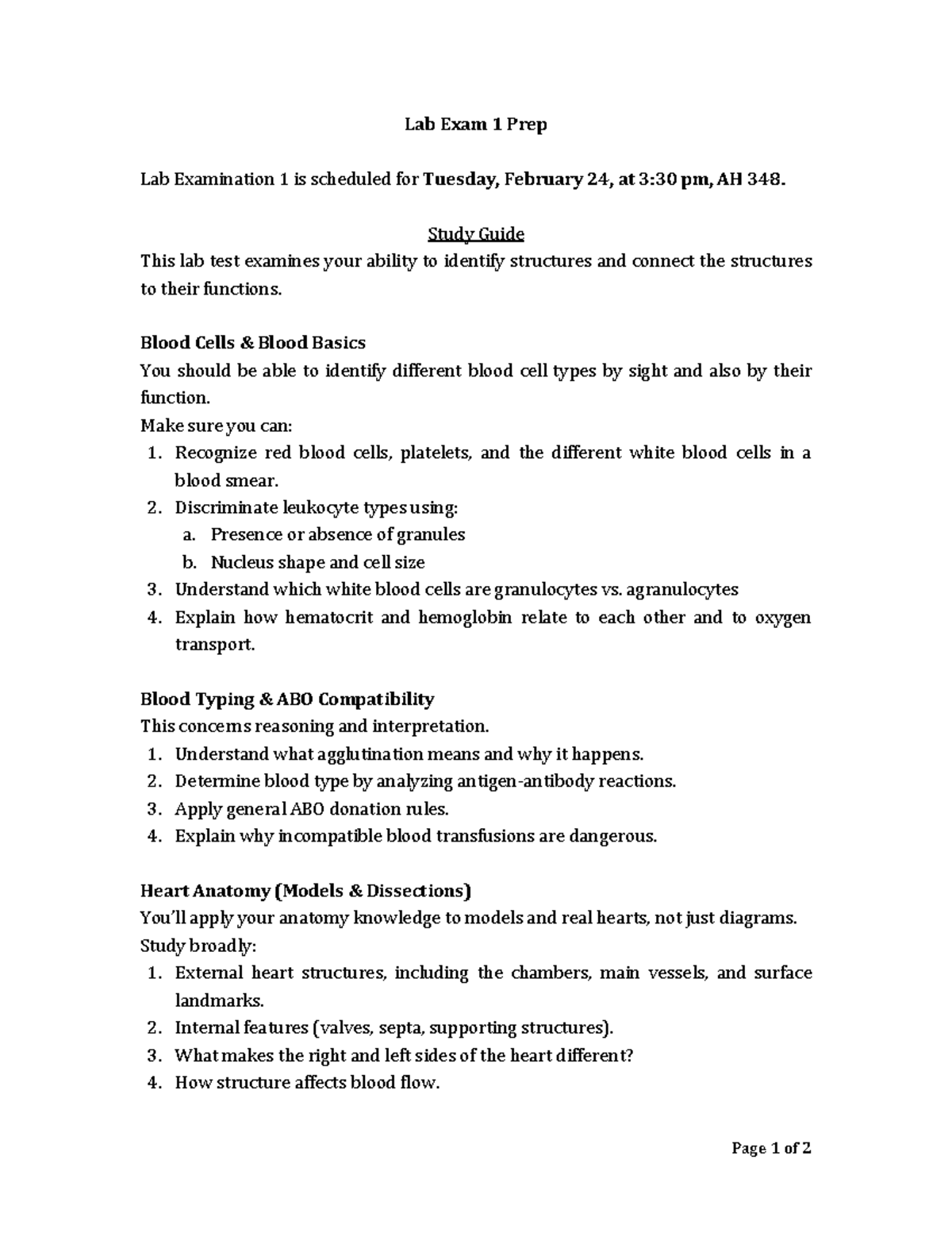 Lab Exam 1 Prep: Blood and Heart Anatomy - Studocu