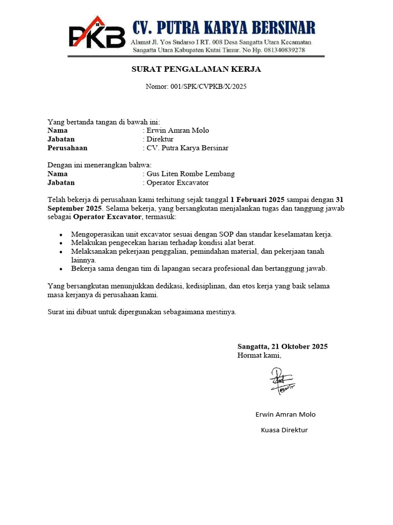 Surat Pengalaman Kerja Operator Exca | PDF