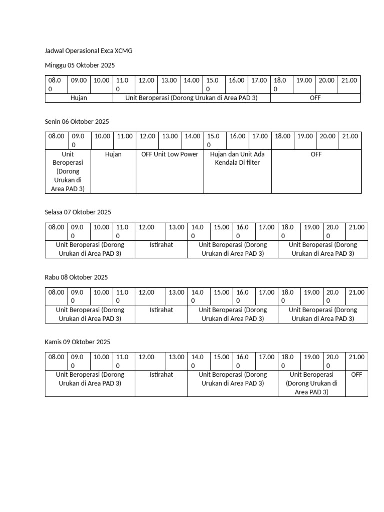 Jadwal Operasional Exca XCMG | PDF