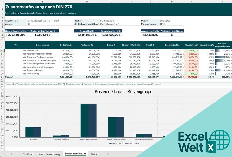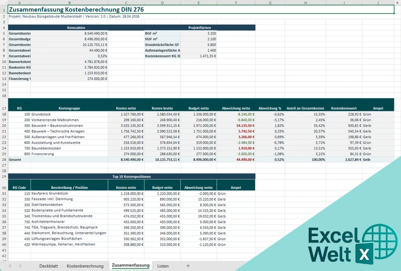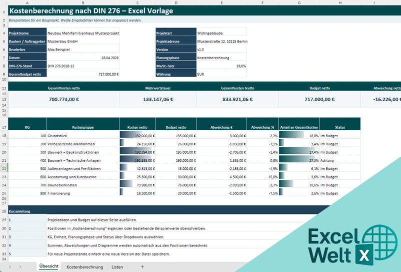 Kostenberechnung DIN 276 Excel Vorlage | Baukosten planen