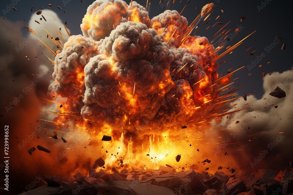 A large explosion is depicted in the image, with a cloud of dust and ...