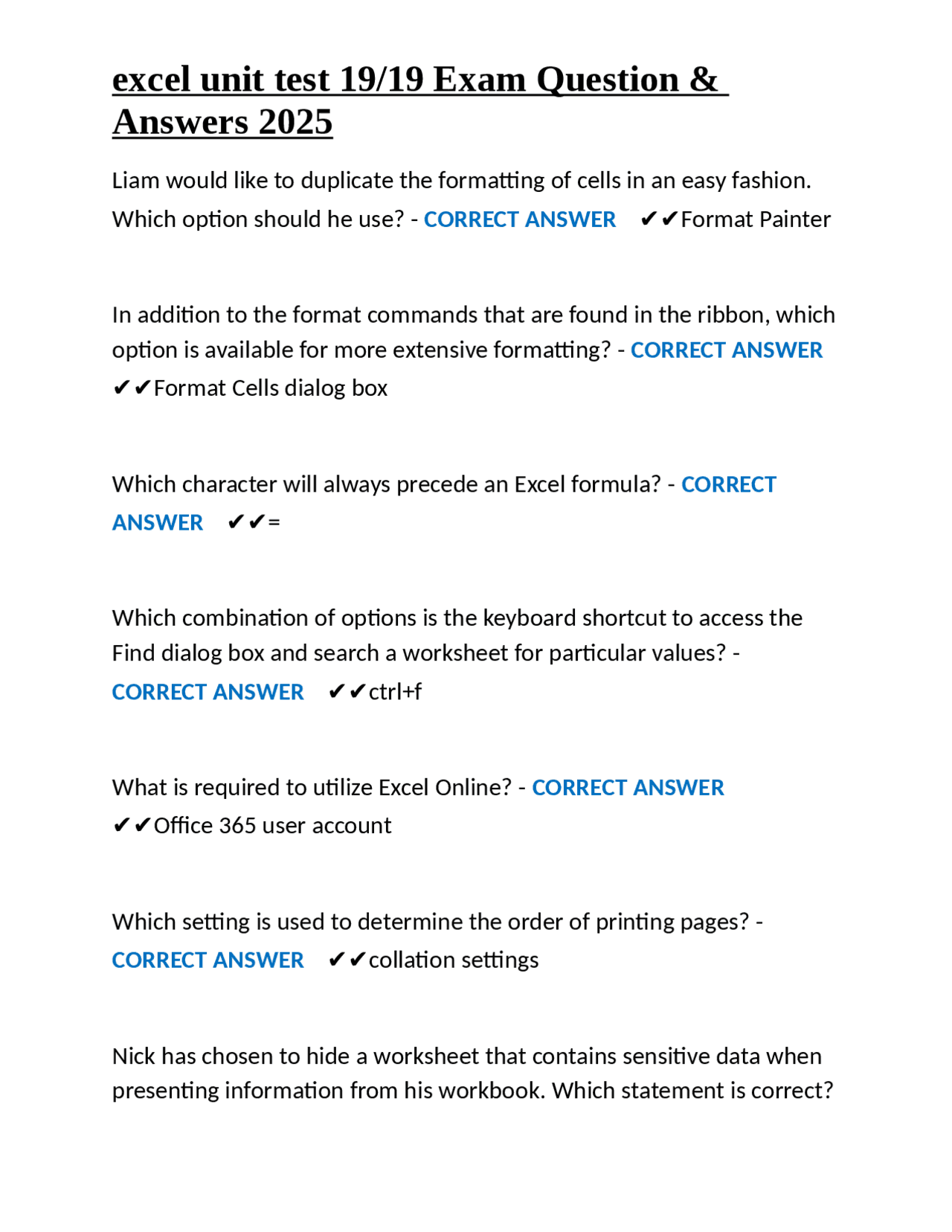 excel unit test 19/19 Exam Question & Answers 2025 | Exams Nursing ...