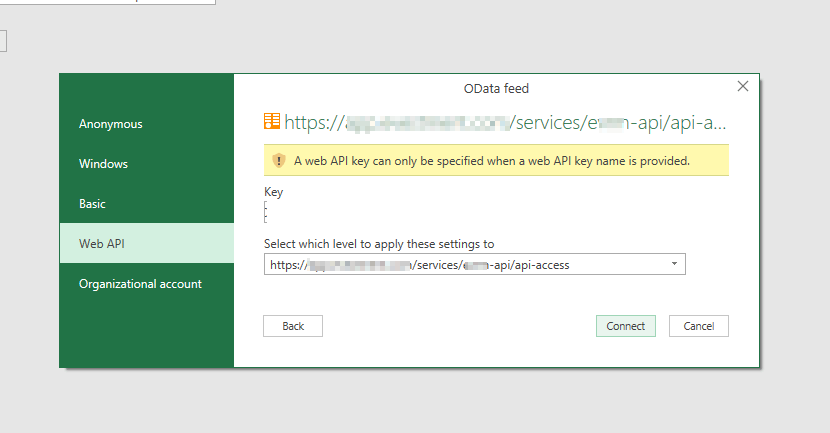 Excel - Odata Connection: "A web API key can only be specified when a ...