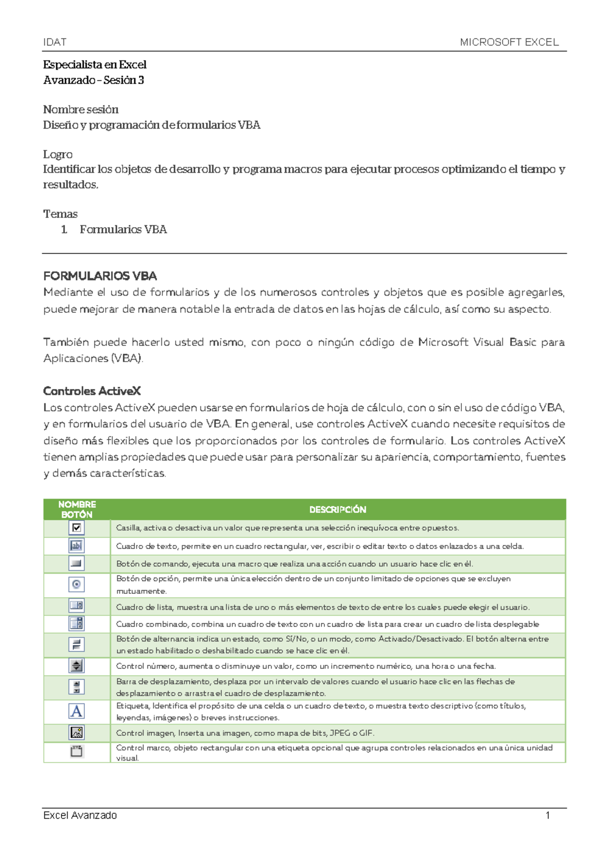 Guía IDAT Excel Avanzado - Sesión 03: Formularios y VBA - Studocu