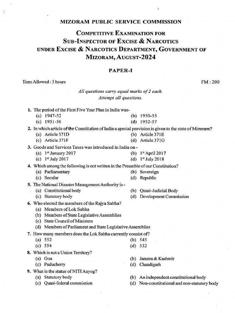 (Exam Papers) Mizoram Police Constable Exam Paper of Excise Narcotics ...