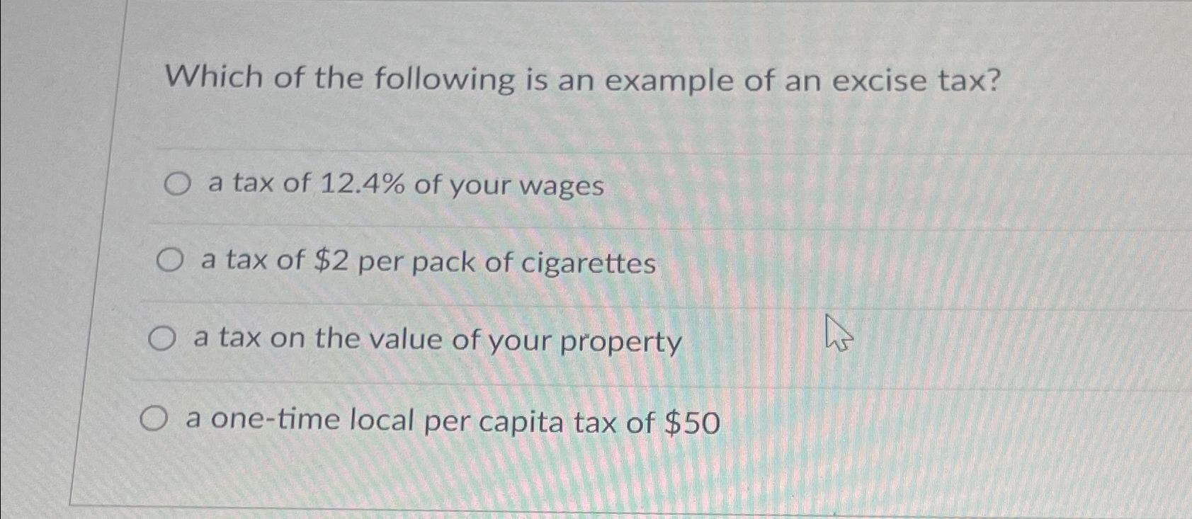 Solved Which of the following are examples of excise taxes? | Chegg.com