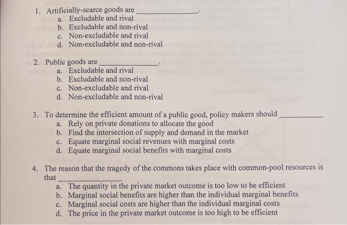 Solved 1. Artificially-scarce goods are a. Excludable and | Chegg.com