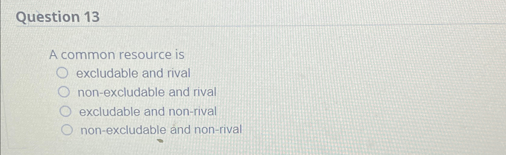 Solved Question 13A common resource isexcludable and rival | Chegg.com
