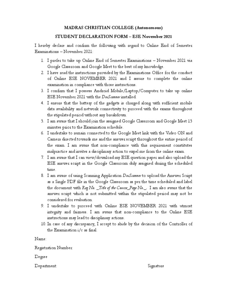 MCC Online ESE Declaration Form 2021 | PDF