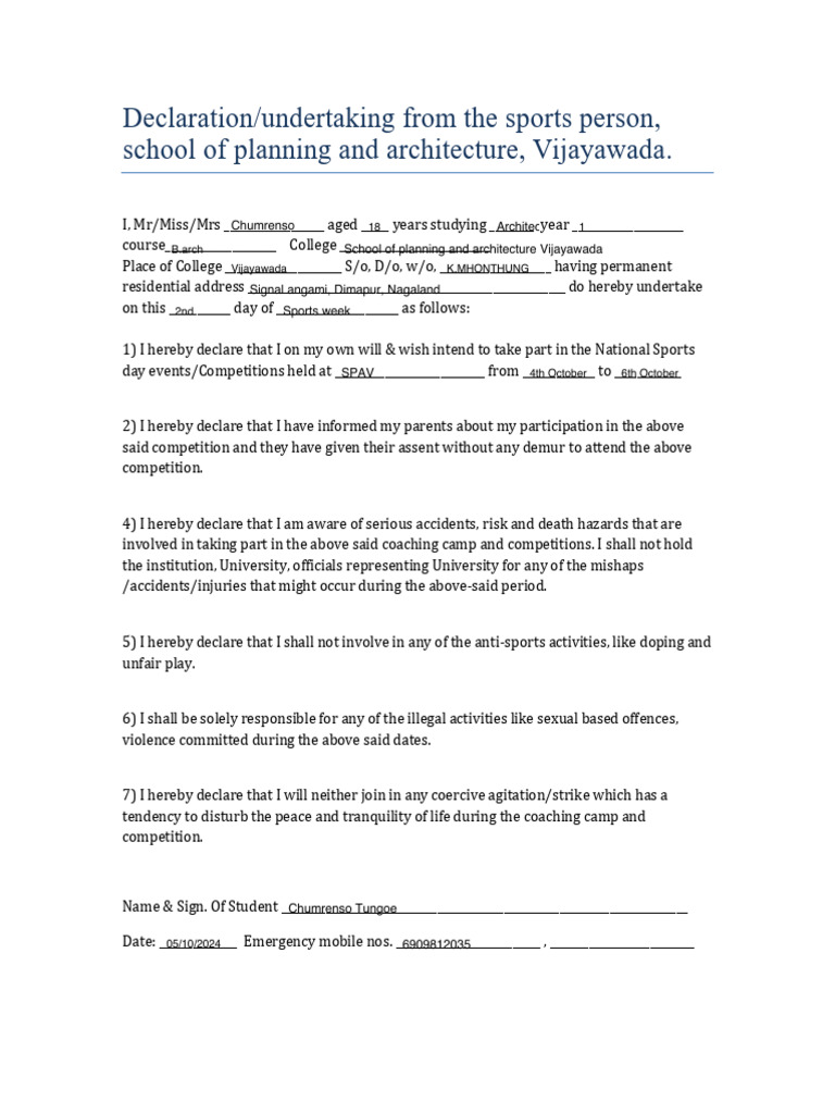 Sample Self Declaration for Medical Fitness in School Sports Event