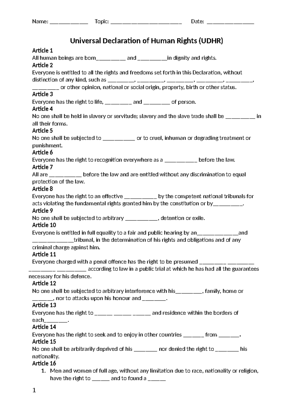 Cloze Exercise: Universal Declaration of Human Rights (UDHR) - Studocu