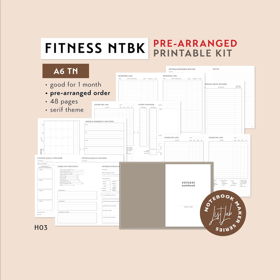 A6 TN FITNESS Notebook Pre-arranged Printable Kit | Traveler's Notebook ...