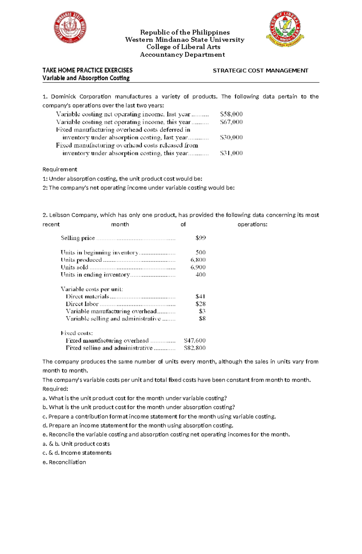 TAKE HOME PRACTICE EXERCISES: Variable & Absorption Costing for SCM ...
