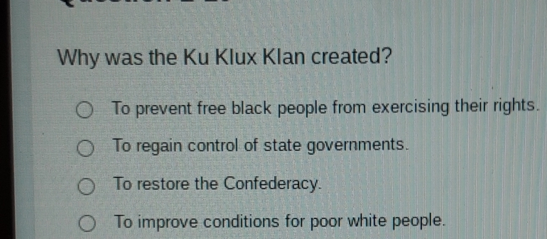 Resuelto:Why was the Ku Klux Klan created? To prevent free black people ...