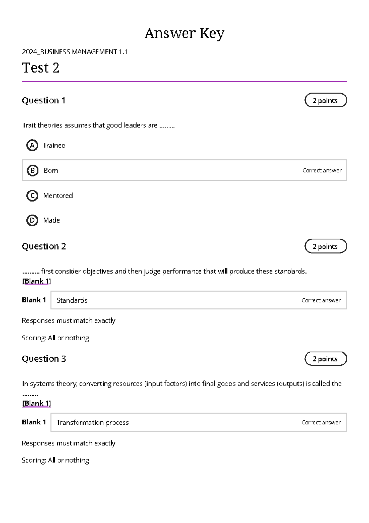 Answer Key for 2024_BUSINESS MANAGEMENT 1.1 Test 2 - Studocu
