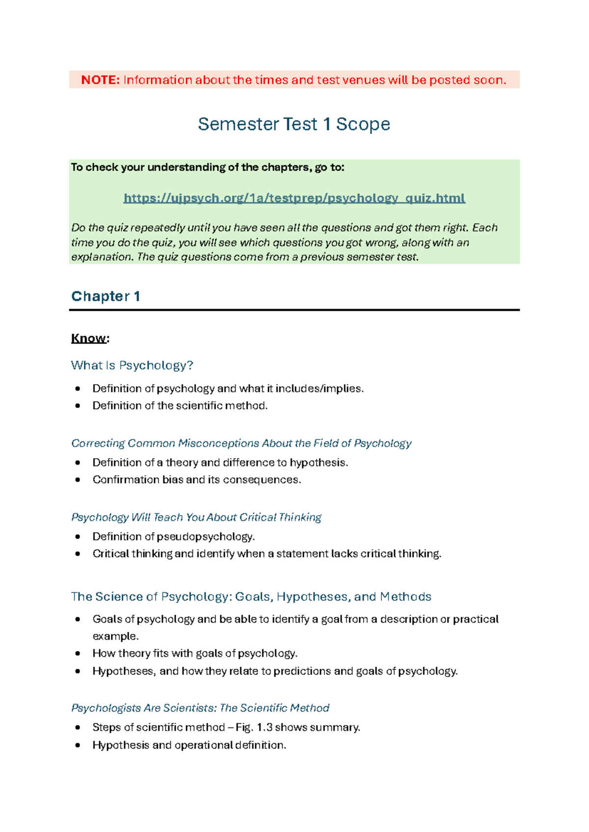 Semester Test 1 Scope - Psychology 101 Overview and Key Concepts - Studocu