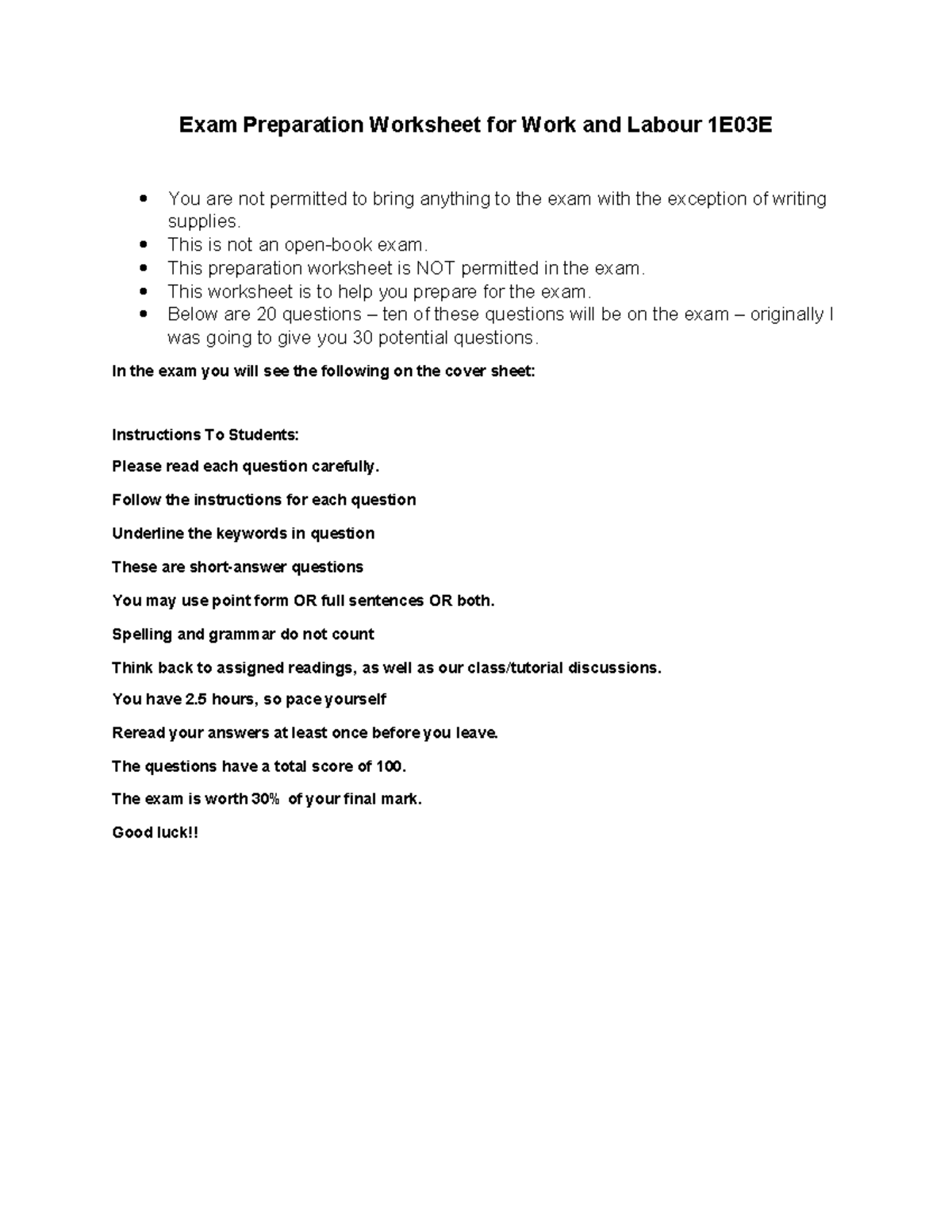 1E03 Final Exam Preparation Worksheet for Work and Labour - Studocu