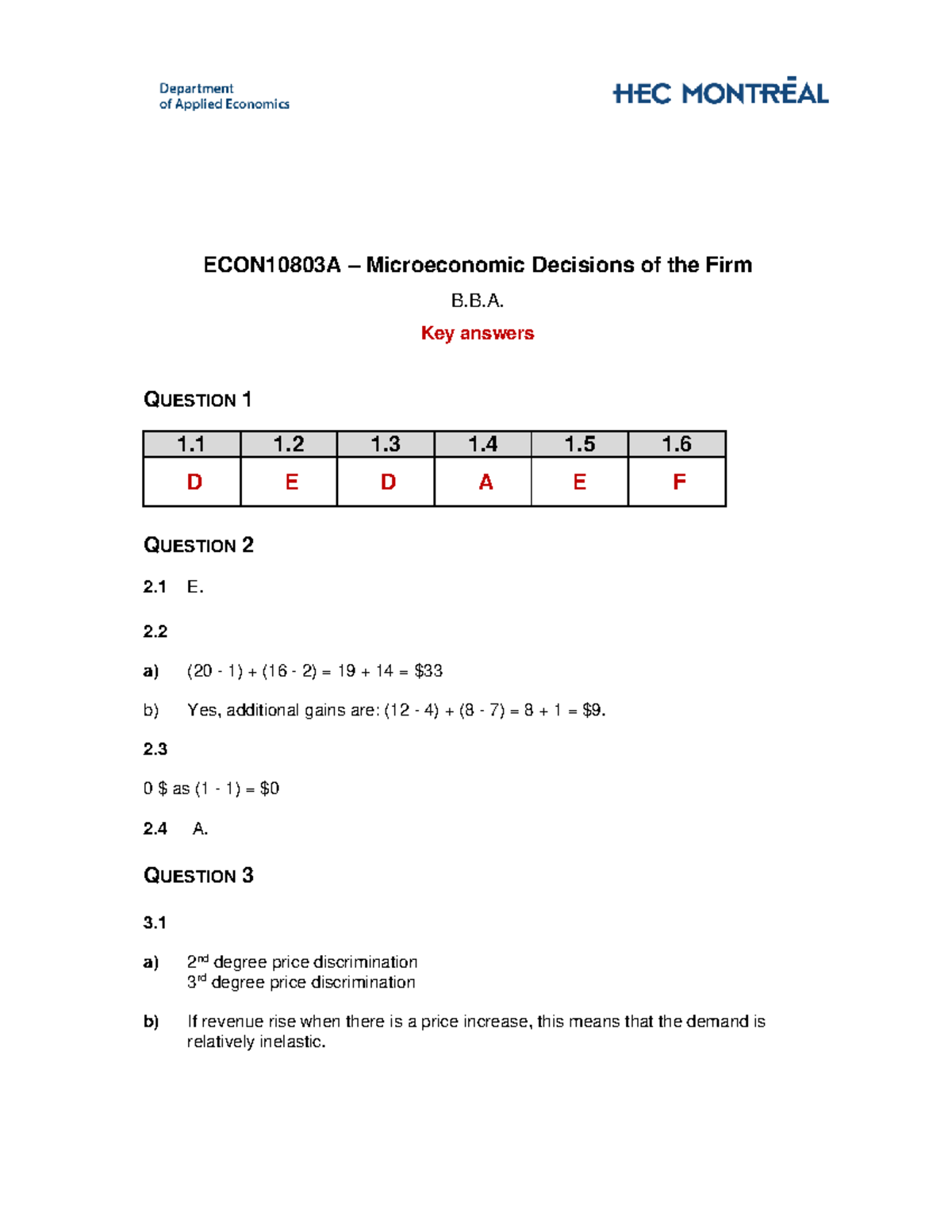 ECON10803A Microeconomic Decisions of the Firm - W2025 Exam Key Answers ...