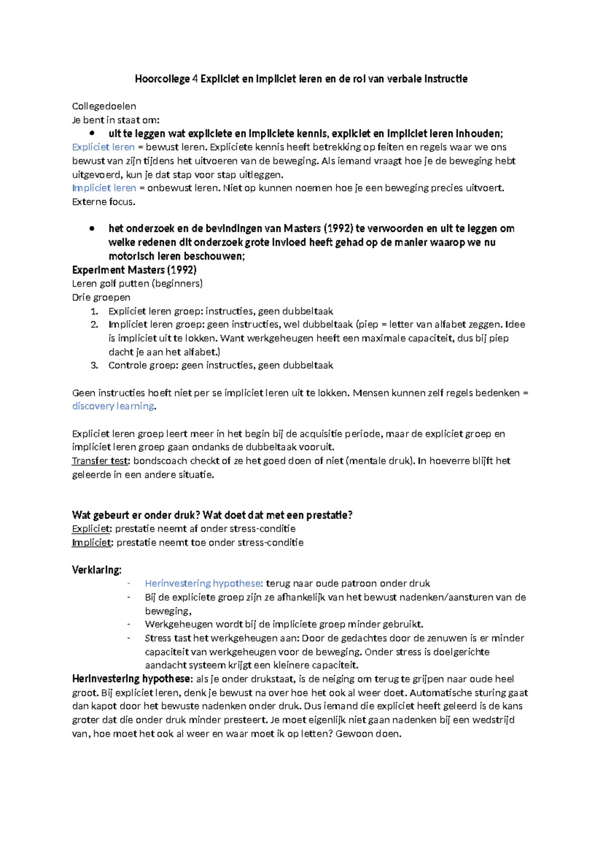 Hoorcollege 4: Expliciet en Impliciet Leren met Verbale Instructie ...