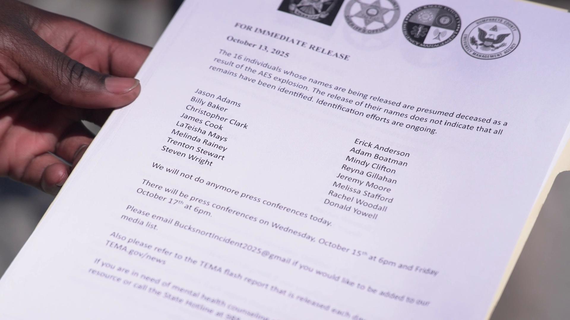 Authorities release names of 16 killed in Tennessee plant explosion