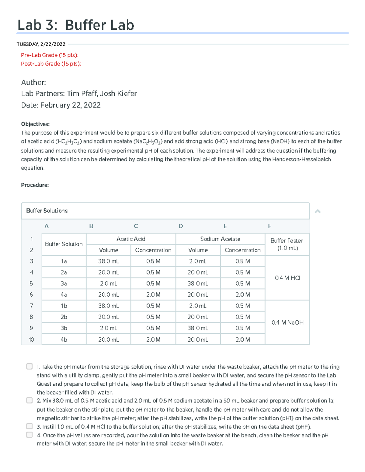 Lab 3: Buffer Solution Experiment - Acetic Acid & Sodium Acetate - Studocu