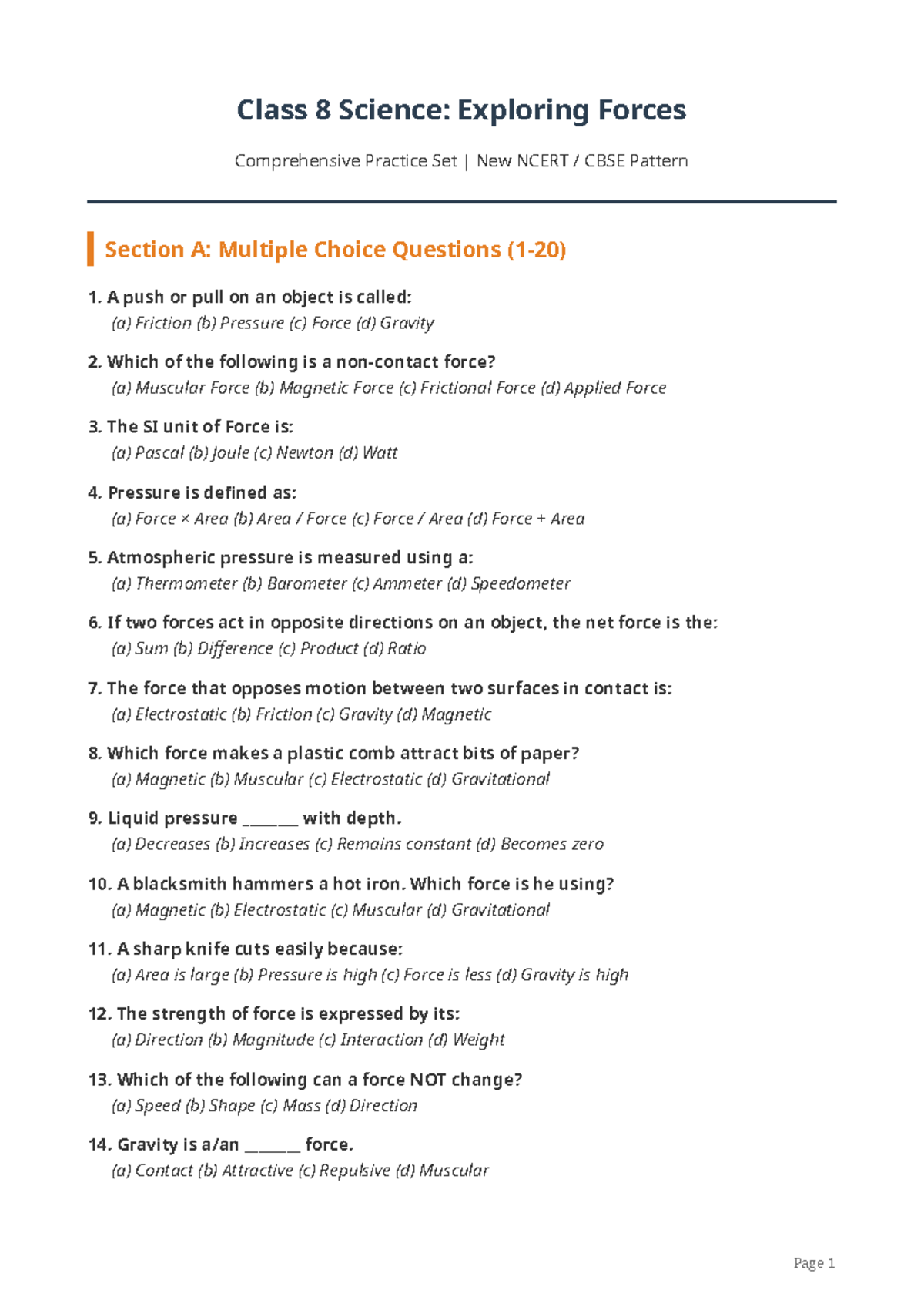 Class 8 Science: Exploring Forces 50 Question Practice Set - Studocu