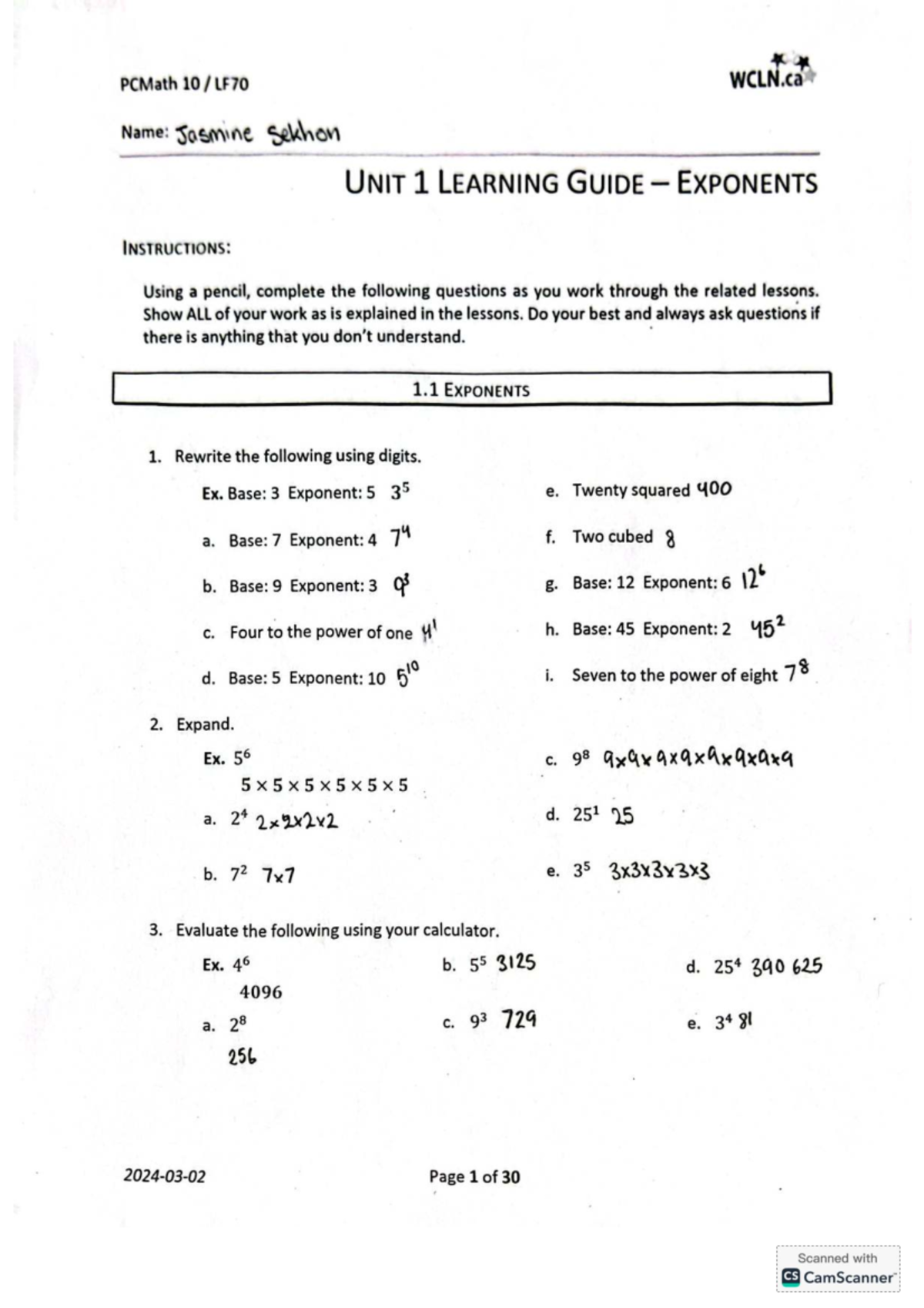 Math 10 WCLN Unit 1 Learning Guide: Exponents - Studocu