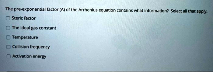 SOLVED:The pre-exponential factor (A) of the Arrhenius equation ...