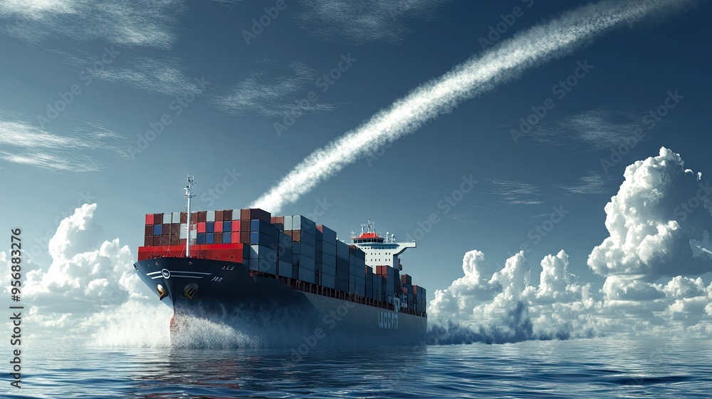 Express cargo container ship with a contrail in the ocean, transporting ...