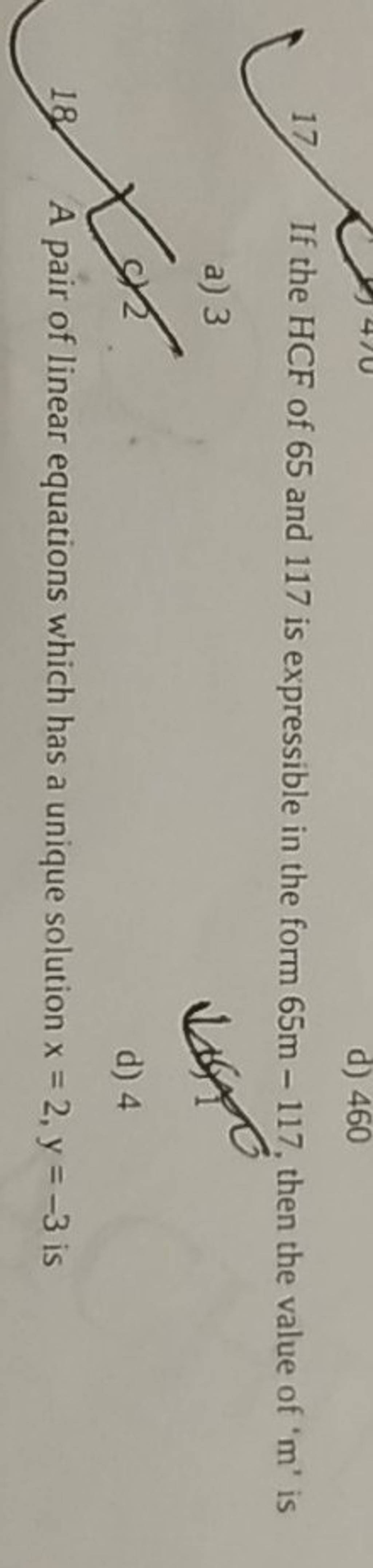 17 If the HCF of 65 and 117 is expressible in the form 65 m−117, then the..