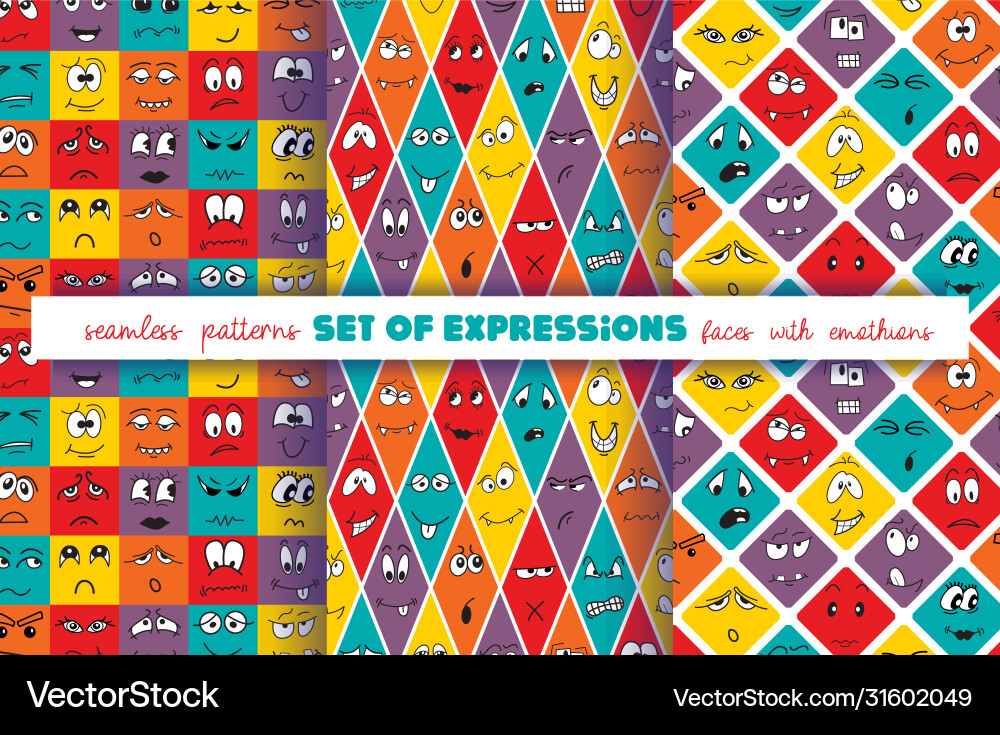 Set 3 expression faces seamless patterns Vector Image