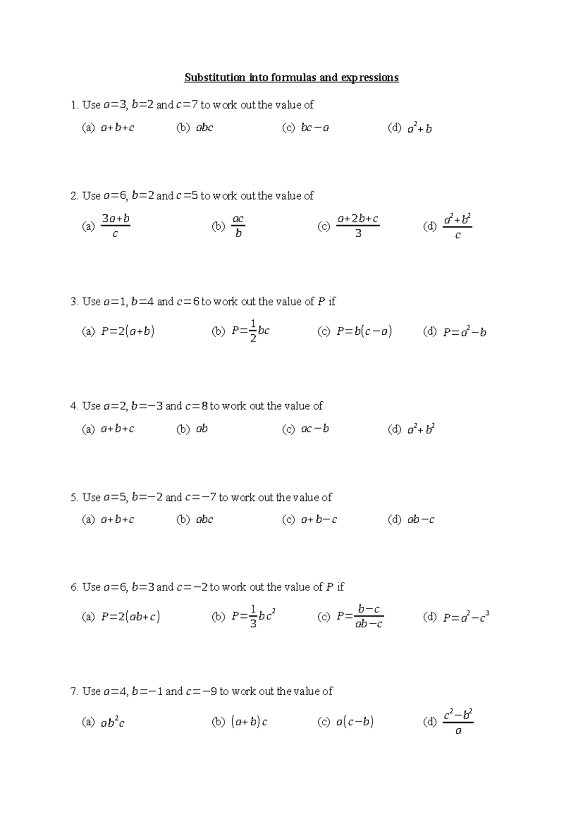 Algebraic Expressions Worksheets For Grade 7 Practicing Substitution