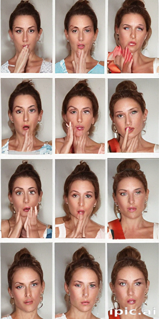 A collection of images featuring a woman making various facial ...