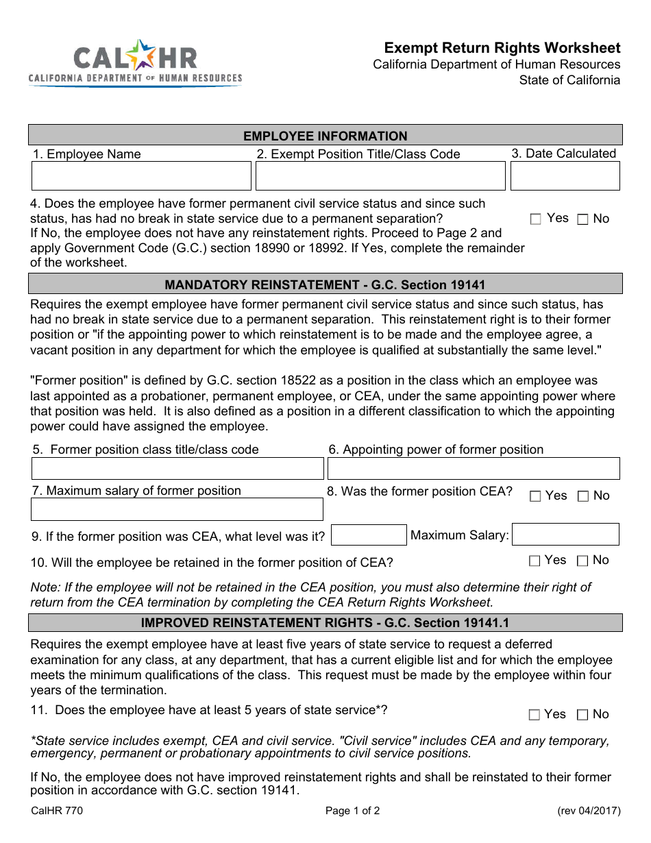 Form CALHR770 - Fill Out, Sign Online and Download Fillable PDF ...