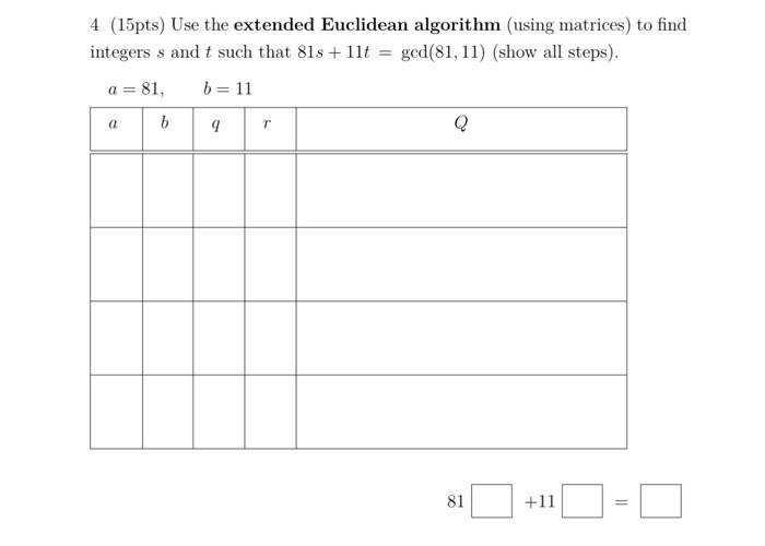 Solved 4 (15pts) Use the extended Euclidean algorithm (using | Chegg.com