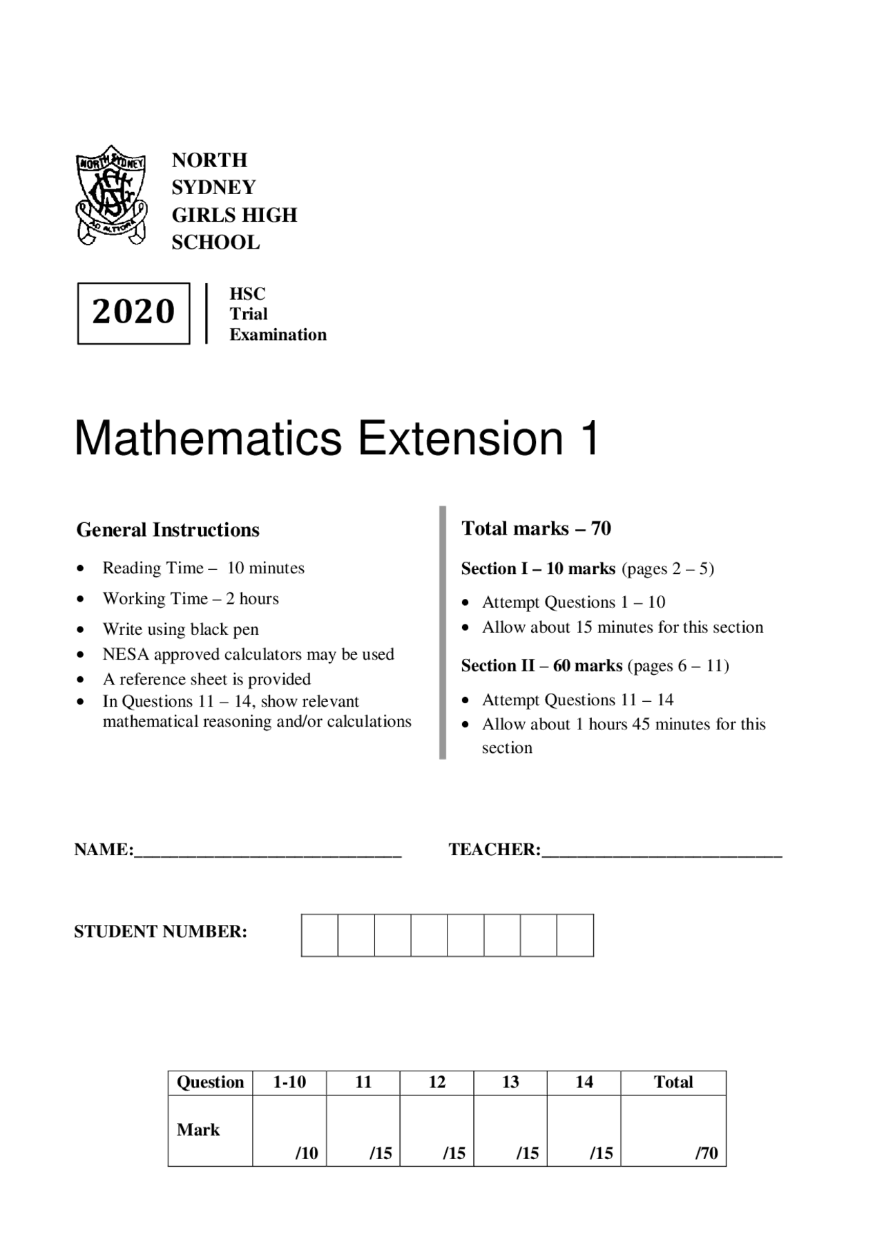 Mathematics Extension 1 Examination: HSC Trial, North Sydney Girls High ...